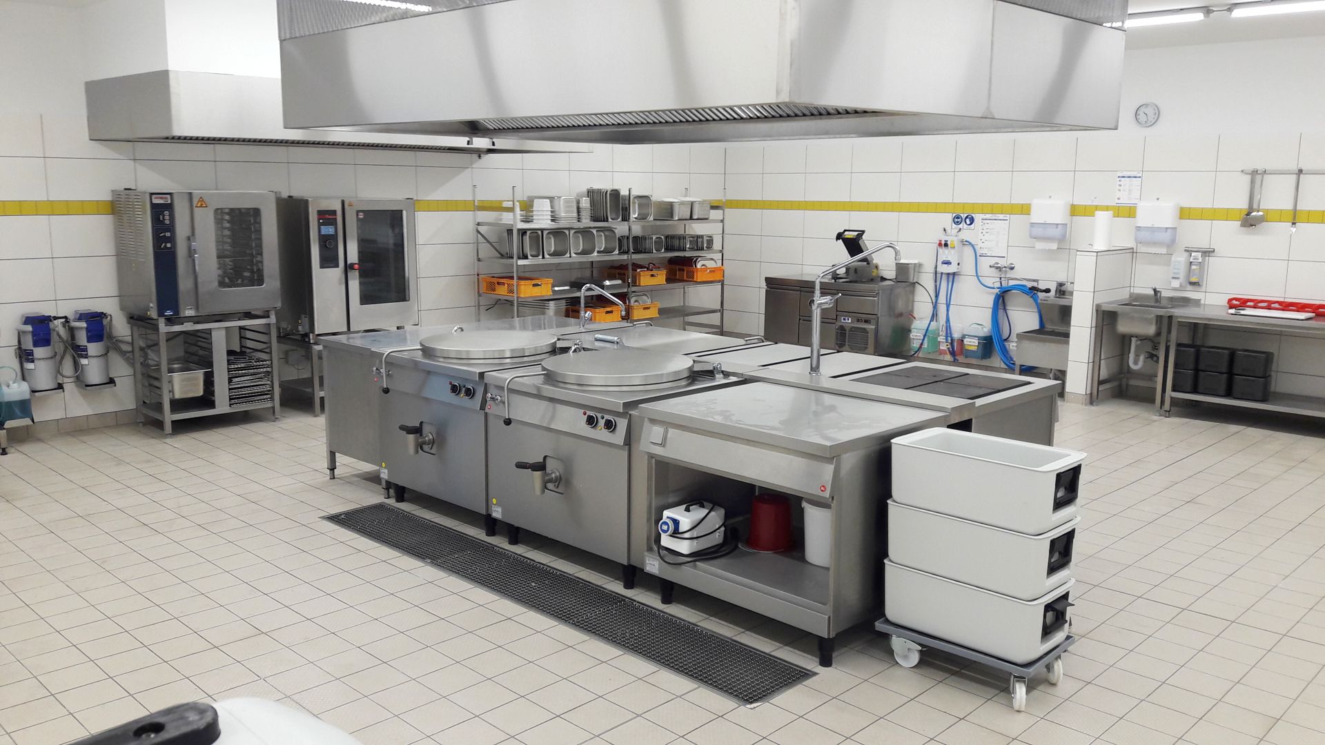 Der entscheidende Tipp kam schließlich vom Kunden selbst: Gefunden wurde ein äußerst verkehrsgünstig gelegenes ehemaliges Autohaus in Leinefelde, das lange leer gestanden hatte. Auch der Eigentümer engagierte sich für eine sinnvolle neue Nutzung und kooperierte beim Umbau eng mit dem Gemeinschaftsversorger. Die RWS Cateringservice GmbH investierte dafür 600.000 Euro ausschließlich aus Eigenmitteln und konnte langjährigen Erfahrungen bei der Einrichtung eigener Küchen nutzen. Eine Besonderheit des rund 500 Quadratmeter großen Objekts in Leinefelde: Die neue Küche wurde nach dem Raum-im-Raum-Konzept in die vorhandene Gebäudehülle quasi hineingesetzt. Die kurze Bauzeit von zwei Monaten spricht für die perfekte Vorbereitung und gute Kooperation aller Gewerke. Die Küche in der Leinefelder Lisztstraße ist nun mit einer modernen Photovoltaikanlage ausgerüstet und wurde energetisch aufgewertet. Im Inneren konzentrierten sich die Arbeiten auf den Einbau moderner Küchentechnik und die Sicherung optimaler Zubereitungsabläufe.