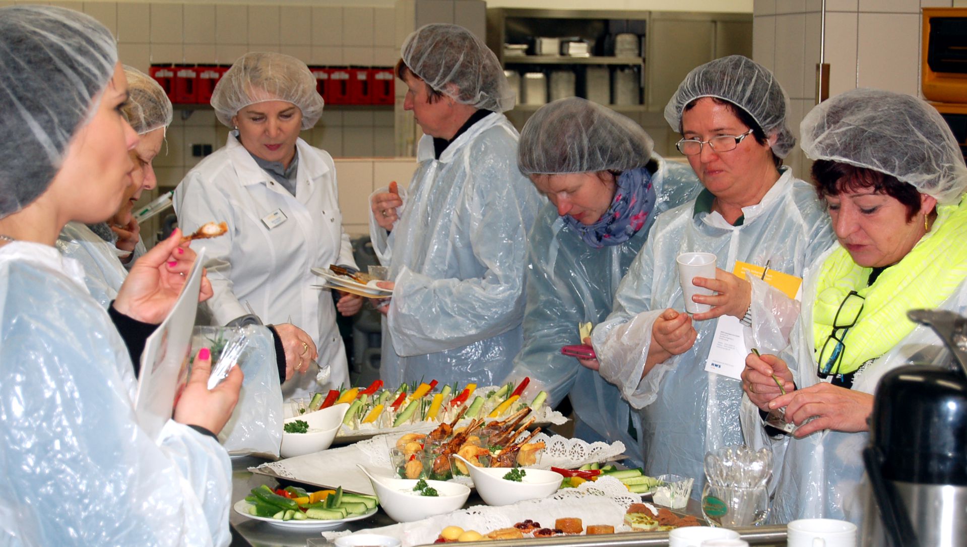 Am 20. März 2017 war es soweit. Nachdem sich der tägliche Trubel in der RWS-Küche gelegt hat und alle sozialen Einrichtungen mit Speisen und Getränken versorgt waren, begrüßte das Torgauer Team um RWS-Küchenleiterin Jutta Urbig die Volkssolidarität Torgau-Oschatz in ihren Hallen. Und noch bevor der Rundgang durch die Küche und ihre Nebenräume um 16.00 Uhr startete, stellten Josef Tremmel, die Kita-Leiterin Astrid Günther-Papendorff, Erzieher und Elternvertreter der Kita „Käthe Kollwitz“ auch schon die ersten Fragen. „Ja, das stimmt. Die Besucherkittel, Hauben und Schuhüberzieher, die Sie tragen, sind Schutzkleidung und für das Betreten unserer Küchen verpflichtend,“ antwortete Jutta Urbig. „Eine einwandfreie Hygiene ist für unsere Speisenzubereitung oberstes Gebot. Da können unsere Waren noch so frisch sein. Nach Ihrem Besuch werden wir die Küche nochmals reinigen.“ Doch an das Ende der Entdeckertour mochte zu diesem Zeitpunkt noch keiner denken. Denn jetzt ging der Rundgang erst richtig los.