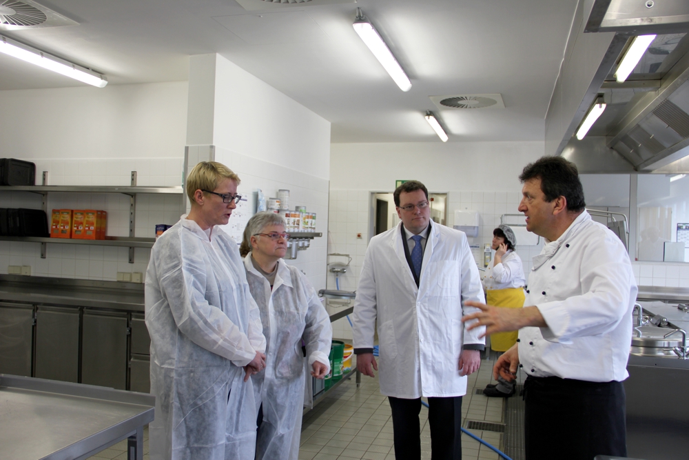 Die neue Produktionsküche der RWS Cateringservice GmbH in Borna ist Anfang März vom Probe- in den Normalbetrieb übergegangen. Von der Leistungsfähigkeit des Küchenteams und den technischen Möglichkeiten vor Ort überzeugte sich auch die Bornaer Oberbürgermeisterin Simone Luedtke. Sie stattete dem Betrieb am 21. März 2016 einen Besuch ab. Dass nach langem Leerstand am Standort wieder produziert wird, freue sie besonders. Sie interessierte sich für den Umfang der Investitionen bei Umbau und Modernisierung sowie den Arbeitskräftezuwachs.
