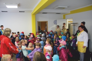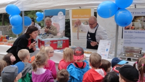 Wir kommen gern zu Ihnen: Gemeinsam backen wir mit den Kindern Waffeln, Plätzchen oder Brot. Wir bereiten mit ihnen Brotaufstriche oder Dips zu. Sie schnippeln mit den Kleinen Gemüse für Rohkostsalate oder bereiten einen Obstsalat oder Smoothie zu. Wann und wo wir mit welcher Aktion übers Jahr in Ihrer Einrichtung sind, kündigen wir über bunt gestaltete Aushänge an.