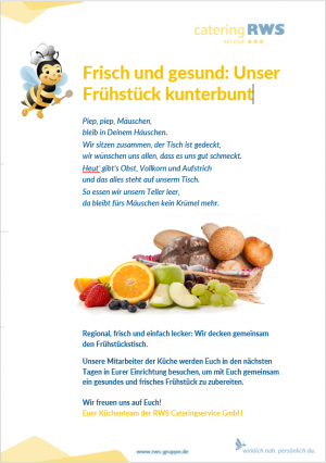 - über E wie Ernährungsbildung mit unseren gesunden Aktionen, z.B. Obst und Gemüse des Monats, Kraut des Quartals oder Getreide des Quartals mit saisonaler Verarbeitung im aktuellen Speiseplan sowie Aushängen mit Wissenswerten zu Herkunft, Geschichte und Rezepten