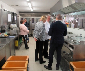 Bereichsleiter Klaus-Peter Schreyer stellt der Geschäftsführerin Cornelia Härtel und dem Regionalleiter Sebastian Oswald die neue Küchentechnik vor