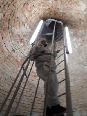 Somit mussten die fleißigen Bienen von RWS sämtliches Equipment wie Staubsauger, Leiter oder Eimer zu Fuß auf den Berg zum Bismarckturm schleppen. Glücklicherweise war es am Tag der Reinigung, am 27. März, nicht ganz so warm. Dennoch schnauften alle Bienen kurz durch, als sie endlich den Gipfel erreichten. Klaus Zeibig, Verantwortlicher der Sehenswürdigkeit und schon im 80. Lebensjahr, kümmert sich mit viel Herz um den Turm. Von ihm wurden die RWS Bienen eingewiesen. „Im Einmalanzug und Mundschutz sahen unsere Bienen schon sehr lustig aus“, so Grit Hecht.