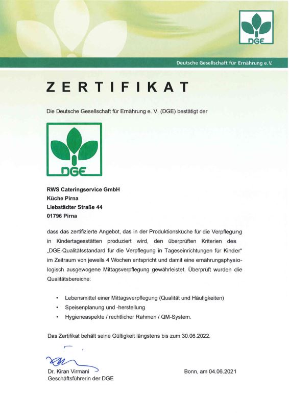 Im Auftrag des Bundesministeriums für Ernährung und Landwirtschaft (BMEL) entwickelte die DGE (Deutsche Gesellschaft für Ernährung e. V.) für verschiedene Lebenswelten, wie Schulen, Kindertagesstätten und Betriebe DGE-Qualitätsstandards. Die RWS Cateringservice GmbH stellte sich erfolgreich der Herausforderung, dem DGE-Qualitätsstandard für die Verpflegung in Tageseinrichtungen für Kinder zu entsprechen und wurde erfolgreich zertifiziert.