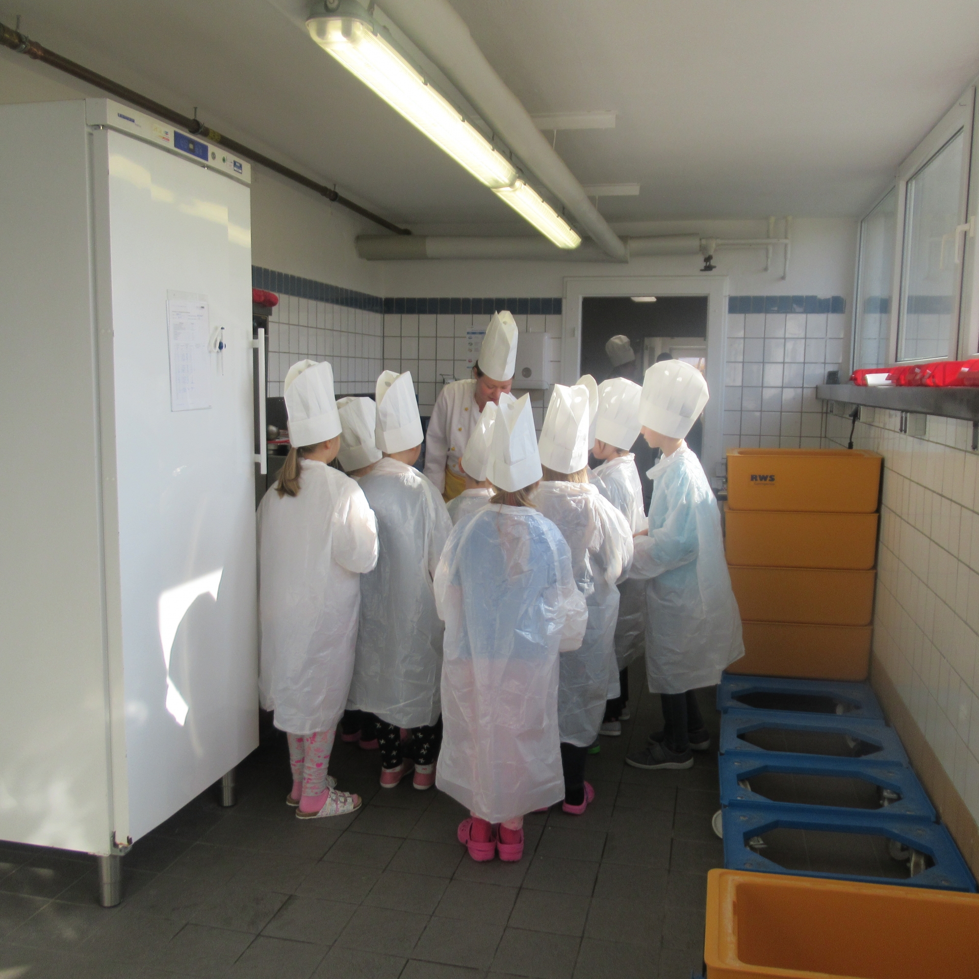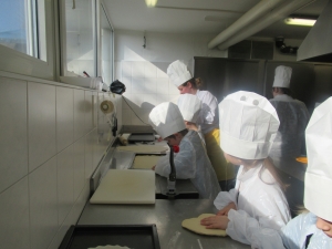 Zu Beginn wurde ein leckerer Pizzateig aus Mehl, Wasser, Hefe und Salz geknetet, der zum Aufgehen seine Zeit benötigte. Um diese Zeit effektiv zu nutzen, wurden bei einer Küchenführung interessante Fragen, die den kleinen Pizzafreunden auf der Zunge lagen, gern vom Küchenteam beantwortet. Für besonderes Erstaunen sorgten die großen Kochkessel und Öfen in der Küche. Aber auch der Pizzateig, der mittlerweile Zeit zum Aufgehen hatte und dabei sein Volumen verdoppelte, sorgte für erstaunte Kindergesichter.