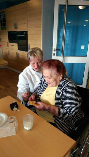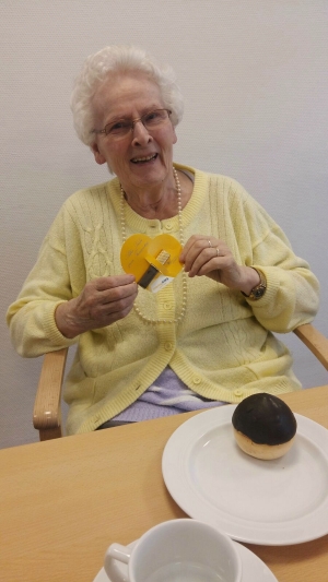 RWS-Küchenleiterin Dajana Steinmetz nahm sich für jede Bewohnerin des Altenpflegeheims der Diakonie Görlitz Zeit und überreichte das Schokoladenherz.