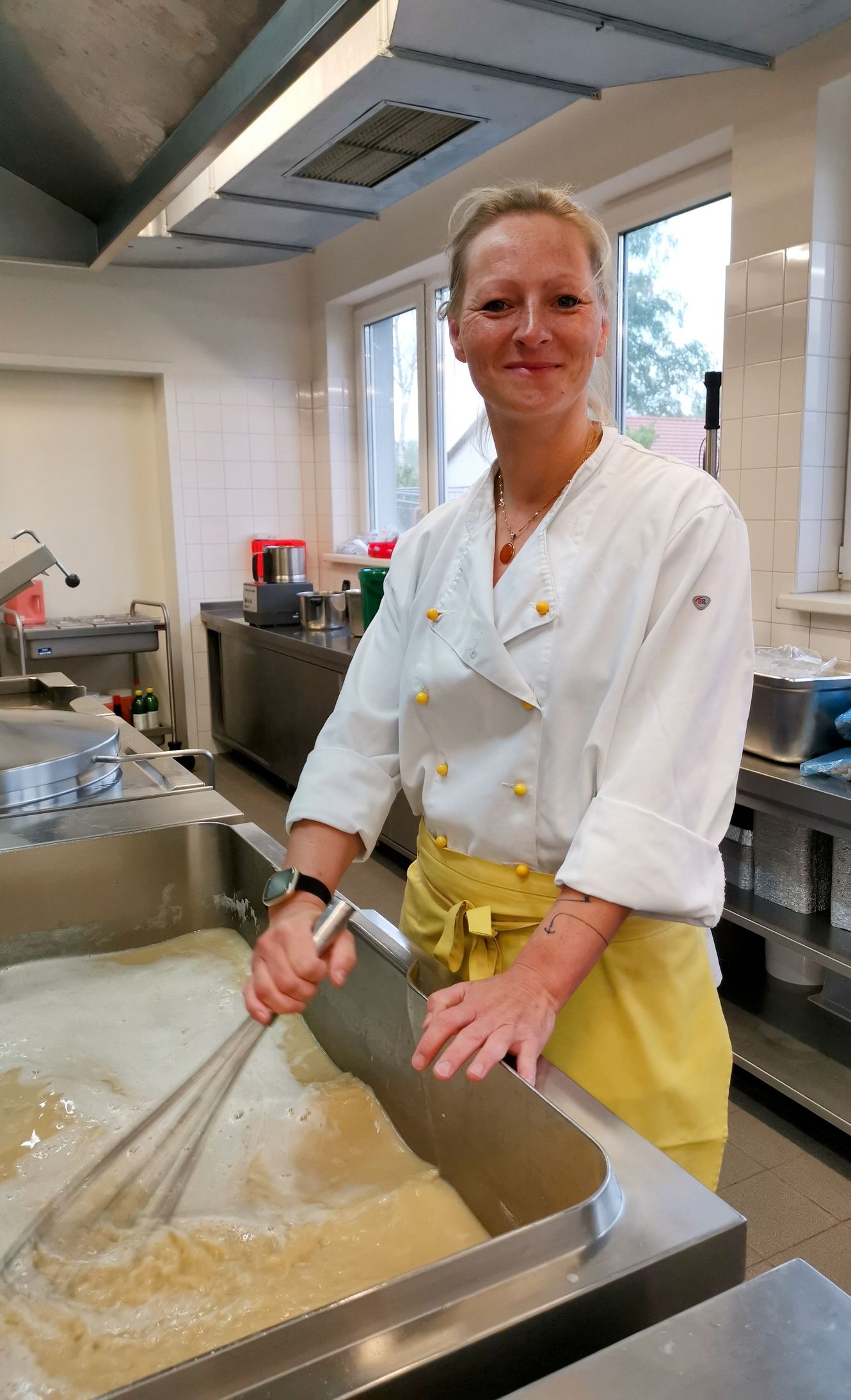 Dajana Steinmetz ist seit nunmehr 10 Jahren bei RWS Cateringservice GmbH und war beim Aufbau der Küche in Schwarzheide von Anfang an dabei. Nach einer herzlichen Begrüßung und einem kurzen Rundgang durch die heiligen Hallen, fanden wir uns im Büro der Küchenleiterin wieder. Es dauerte nicht lange, da wurden auch schon die ersten Fragen in den Raum geworfen. Welche Aufgaben gefallen Ihnen besonders in Ihrem beruflichen Alltag? Welche Aufgaben stellen Sie vor Herausforderungen? „Was mir besonders gefällt, ist die Mischung, die es macht. Ich bin das schon oft gefragt worden. Ich bin wirklich jemand, der gerne mal am Kessel oder an der Pfanne so richtig ranklotzt. Aber ich liebe es auch, ins Büro zu gehen und Zahlen und Kalkulationen vor mir zu haben. Diese Abwechslung zwischen Büroarbeit und Küchenalltag macht meinen Beruf so interessant. Vor besondere Herausforderung stellen mich spontane Änderungen, die vor allem seit der Pandemie häufig eintreten. Wenn sich Portionszahlen ändern, auf die schnell reagiert werden muss. Das macht es dann schwer, aber auch spannend.“ Mit Herz und Seele dabei: Dajana Steinmetz in ihrer RWS Küche in Schwarzheide.