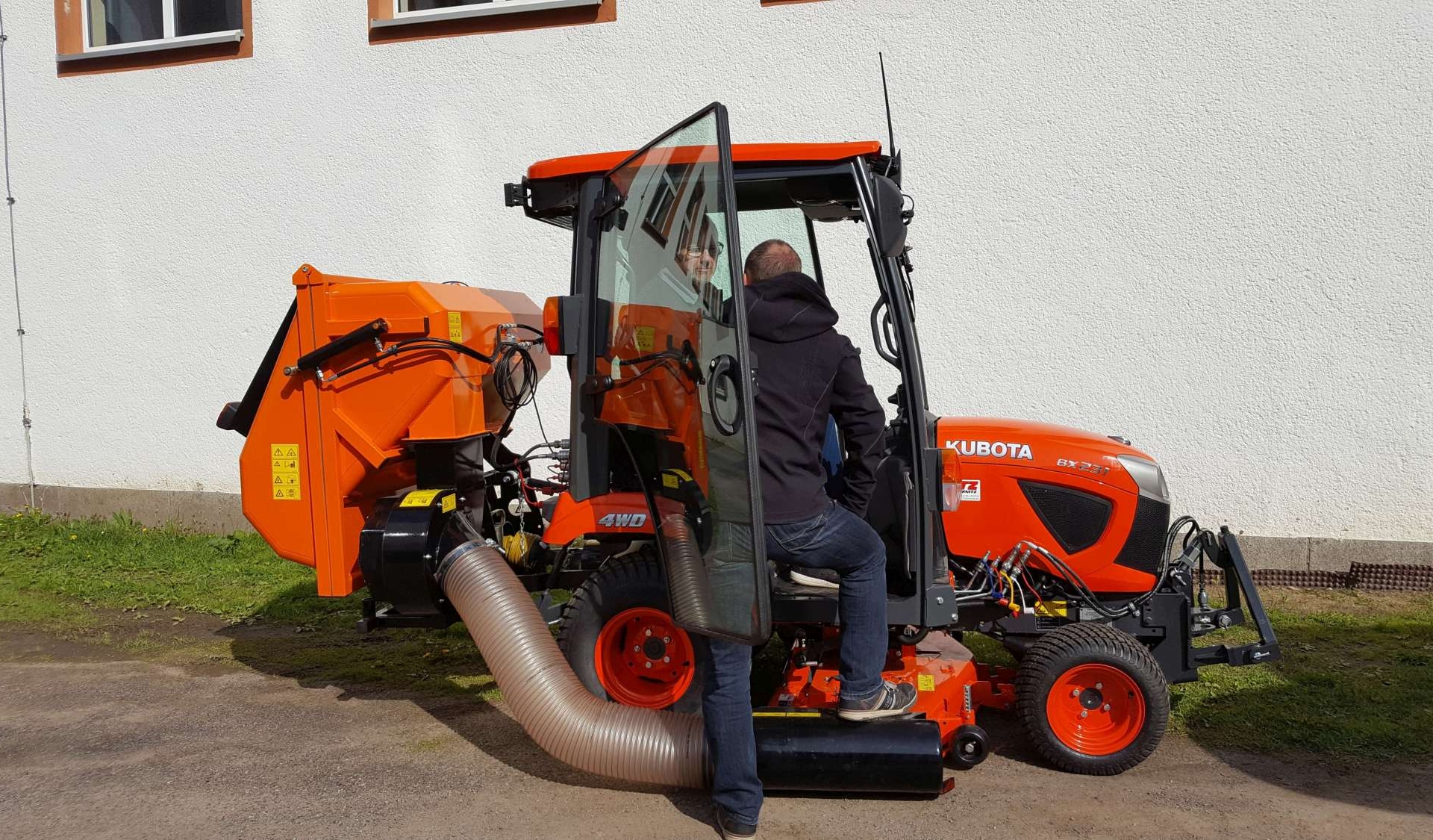 „Der Traktor macht mich und meine Arbeit im Außenbereich das ganze Jahr über flexibel“, schwärmt Mario Fröbe. Denn auch bei schlechter Witterung verfügt der Hausmeister über einen trockenen Arbeitsplatz in der überdachten Fahrerkabine, die zudem beheizbar ist. Je nachdem, welche Arbeiten anstehen, sind zudem Mähwerk oder Kehrmaschine in kürzester Zeit und mit wenigen Handgriffen ab- oder angebaut. Die entstehende Zeitersparnis kann er nun noch mehr zur Wartung des Schulgebäudes nutzen. „Es gibt immer was zu tun. Jetzt bleibt mehr Zeit für Kleinreparaturen oder Tätigkeiten, die zuvor warten mussten, weil anderes dringender war.“