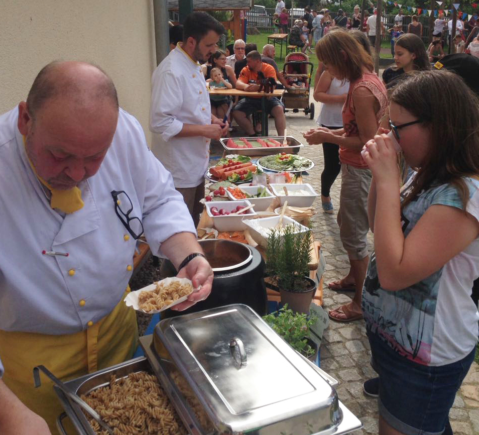 „Das Fest im ‚Kinderparadies’ zu unterstützen, war für uns eine Selbstverständlichkeit“, erklärt Jörg-Manuel Steffen, der zuständige Bereichsleiter beim RWS Cateringservice. Gemeinsam mit Uwe Beyer, erfahrener Koch in der RWS-Produktionsküche Zwickau, war er am Kindertag auch selbst vor Ort an der Naherholung in Bernsdorf. Er nutzte zugleich die Gelegenheit, Eltern und Gästen das Angebot des Gemeinschaftsversorgers näher vorzustellen. Auch Erwachsene oder ältere Geschwister konnten zum Beispiel das Mittagsgericht der Kita-Sprösslinge vom Tage verkosten: Nudeln, Tomatensoße und Reibekäse oder Hackfleisch-Lauch-Eintopf mit Hirtenkäse. Darüber hinaus gab es zusätzliche Stärkung aus dem Frühstücks- und Vesperspeiseplan von RWS, unter anderem Gemüsesticks mit hausgemachten Dips, frisches Obst und verschiedene Brotaufstriche. „Wir konnten zeigen, dass wir speziell auf die Jüngsten zugeschnittene Angebote machen, die vitaminreich sind und frisch auf den Tisch kommen“, freute sich auch der Koch. So wird in der Zwickauer Produktionsküche als tägliches Wahlessen auch die auf den Nährstoff- und Energiebedarf von Kindern optimierte Menülinie RWS OptiMahl gekocht. Die „Piraten“ und ihre Festgäste bedienten sich tüchtig am Buffet und es gab so gut wie einhelliges Lob für das Küchenteam.