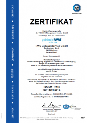 Vor wenigen Wochen freute sich die RWS Gebäudeservice GmbH über einen besonderen, vorzeitigen Abschluss des Jahres. Der TÜV Süd hat das Qualitäts- und Umweltmanagementsystem des Gebäudedienstleisters nach den aktuellen Vorgaben der Qualitäts- und Umweltmanagementnormen zertifiziert. Die internationalen Normen für das Qualitätsmanagement ISO 9001 und für das Umweltmanagement ISO 14001 wurden 2015 neu überarbeitet veröffentlicht. Mit besonderer Sorgfalt und Engagement passte das Team um Kristin Vogel das eigene Qualitäts- und Umweltmanagementsystem auf die aktualisierten Anforderungen an – deutlich vor Ablauf der offiziellen Frist zum September 2018 und mit ausgesprochen positiver Bewertung durch die Auditoren.