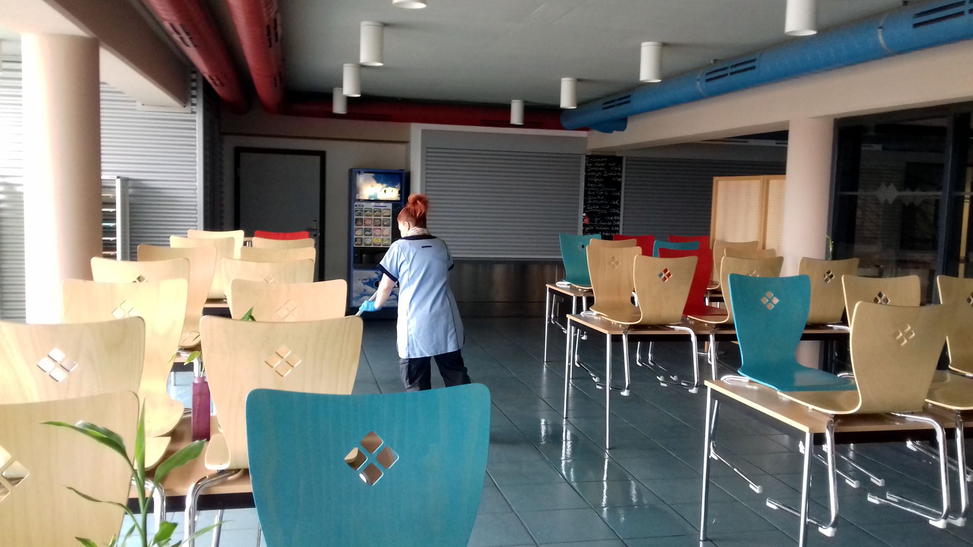 „Jeden Tag nach Schulschluss fängt unsere Arbeit an“ freut sich Kerstin Fröbel, die von Anfang an im RWS-Reinigungsteam dabei ist. „In drei Teams reinigen wir die Schulräume, Sanitäranlagen, Flure und Treppenhäuser, die Cafeteria und die Sporthalle. Ich habe schon viele Schulen gereinigt, die Fortis Akademie hat aber was Besonderes an sich.“