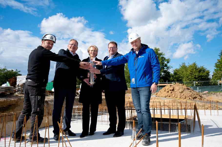 Hand drauf für den RWS-Firmenneubau: Sebastian Kunkel (l.), Polier der Rommel Bau GmbH & Co. KG, und Nils Heumann (re.), Architekt und Bauleiter der Planungsgesellschaft S&P Sahlmann GmbH, vertreten die ausführenden Firmen. Cornelia Härtel (Mitte) und Felix Weiske (2.v.r.), Geschäftsführer der RWS Cateringservice GmbH, stehen als Bauherren und Fred Weiske für die gesamte RWS Gruppe als künftige Nutzer