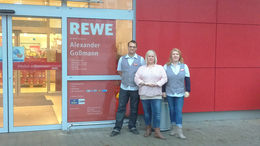 Mit ihnen fing alles an: REWE-Marktleiter Alexander Goßmann (l.) mit Ehefrau Sandra (r.) in Schmiedefeld, in der Mitte RWS-Gebietsleiterin Mandy Glaser.