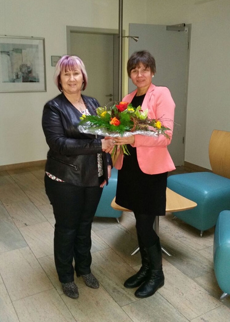 Blumen zum Betriebsjubiläum: Dank und Anerkennung von RWS-Gebietsleiterin Elke Reichardt (re.)