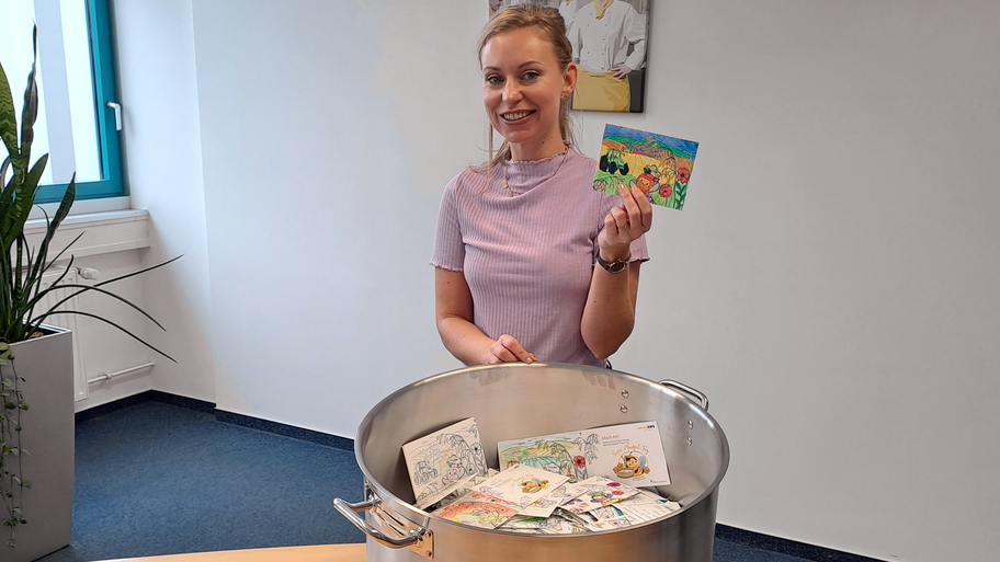 Und nun war es soweit: Die 25 Gewinner wurden von Bienenglücksfee Annett Schiffler vom Catererteam RWS ausgelost. „Das war gar nicht so einfach“, schmunzelt Heike Vogel, RWS-Regionalleiterin Mitte. „Denn die Flut an Einsendungen war überwältigend.“ Gemeint sind die knapp tausend Karten, welche den Kita- und Schulcaterer aus den Einrichtungen in Sachsen, Sachsen-Anhalt, Thüringen und Brandenburg erreichten. Zur Verlosung brauchte es einen großen Kochtopf und natürlich die Bienen-Superkraft der RWS Glücksfee mit goldenen Auslosungsfühlern.