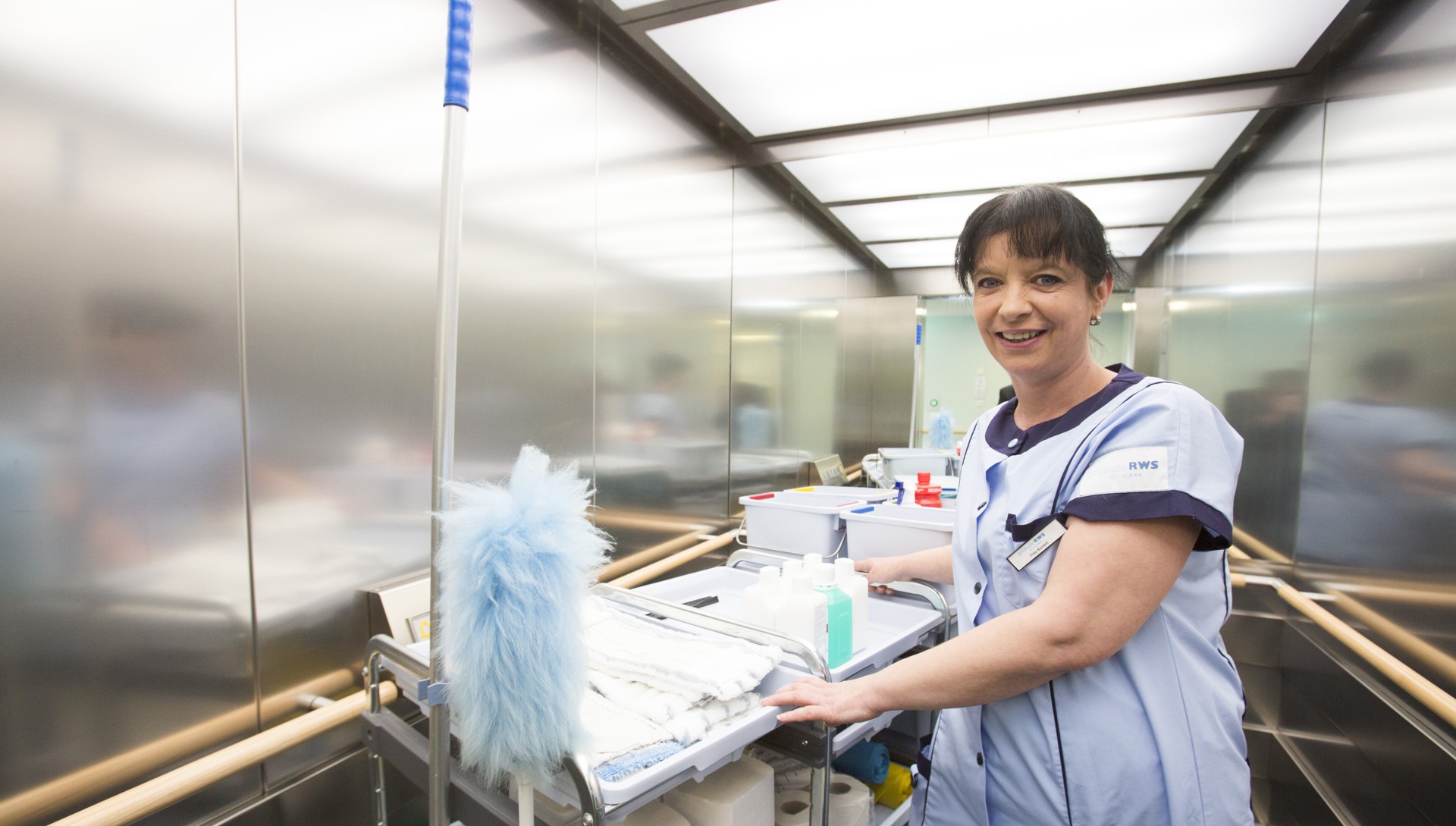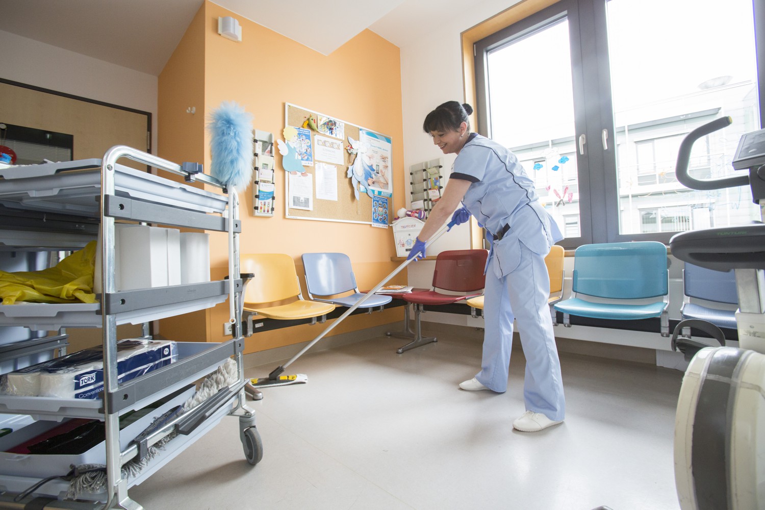 „Auf jeder Station ist meine Telefonnummer hinterlegt“, so Antje Kunert. „Sobald sich in einem Wartezimmer ein Kind erbricht oder irgendwo ein Blumentopf umfällt – dann kann ich gerufen werden, um so schnell wie möglich Sauberkeit und Ordnung wieder herzustellen. Eine Ausnahme gibt es: Wenn ich auf der Neonatologie bin, kann ich, wenn irgendwo etwas passiert ist, nicht gleich lossausen. Wenn ich einmal durch die Hygieneschleuse bin, muss ich dort erst meine Runde zu Ende machen.“