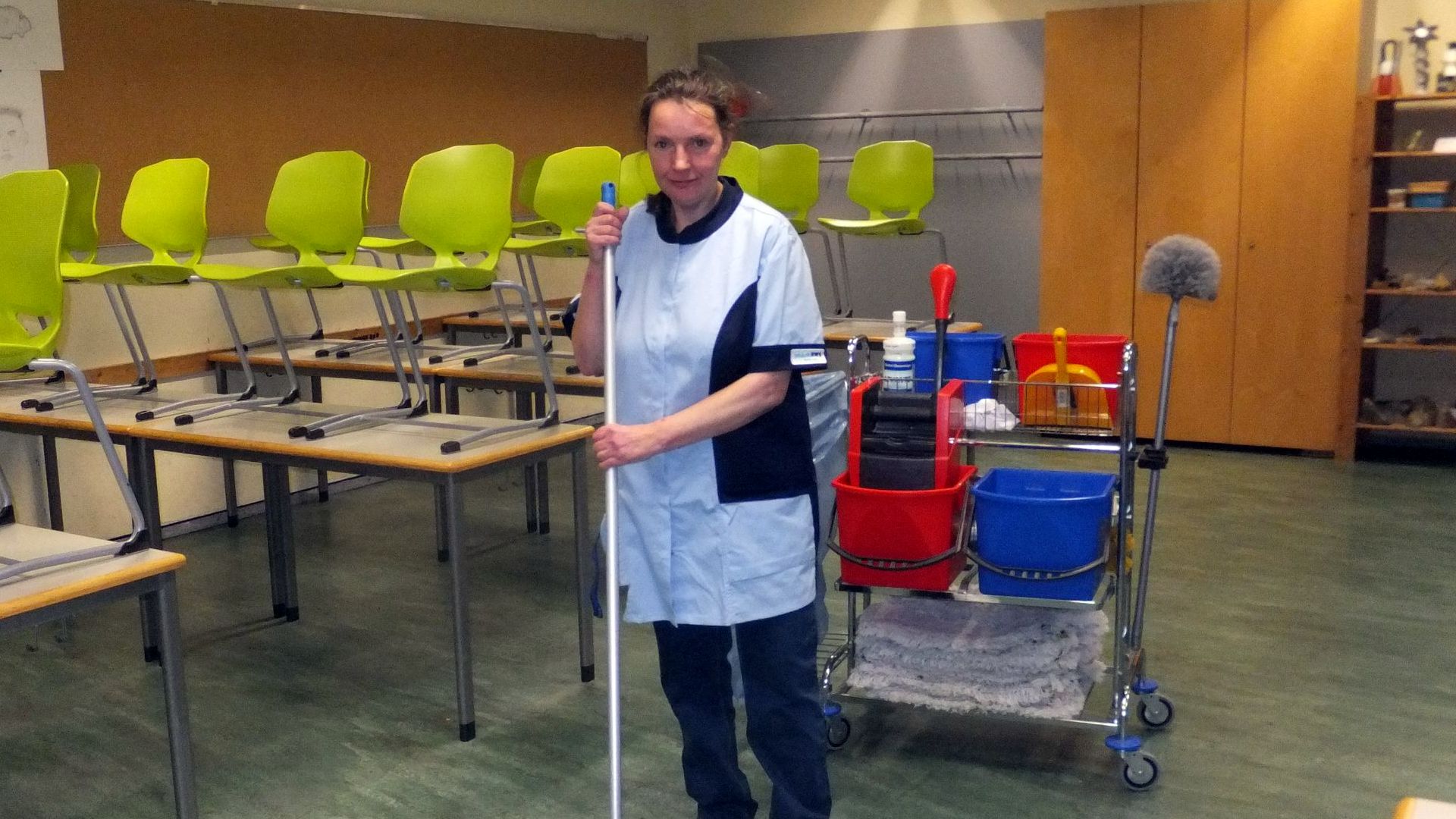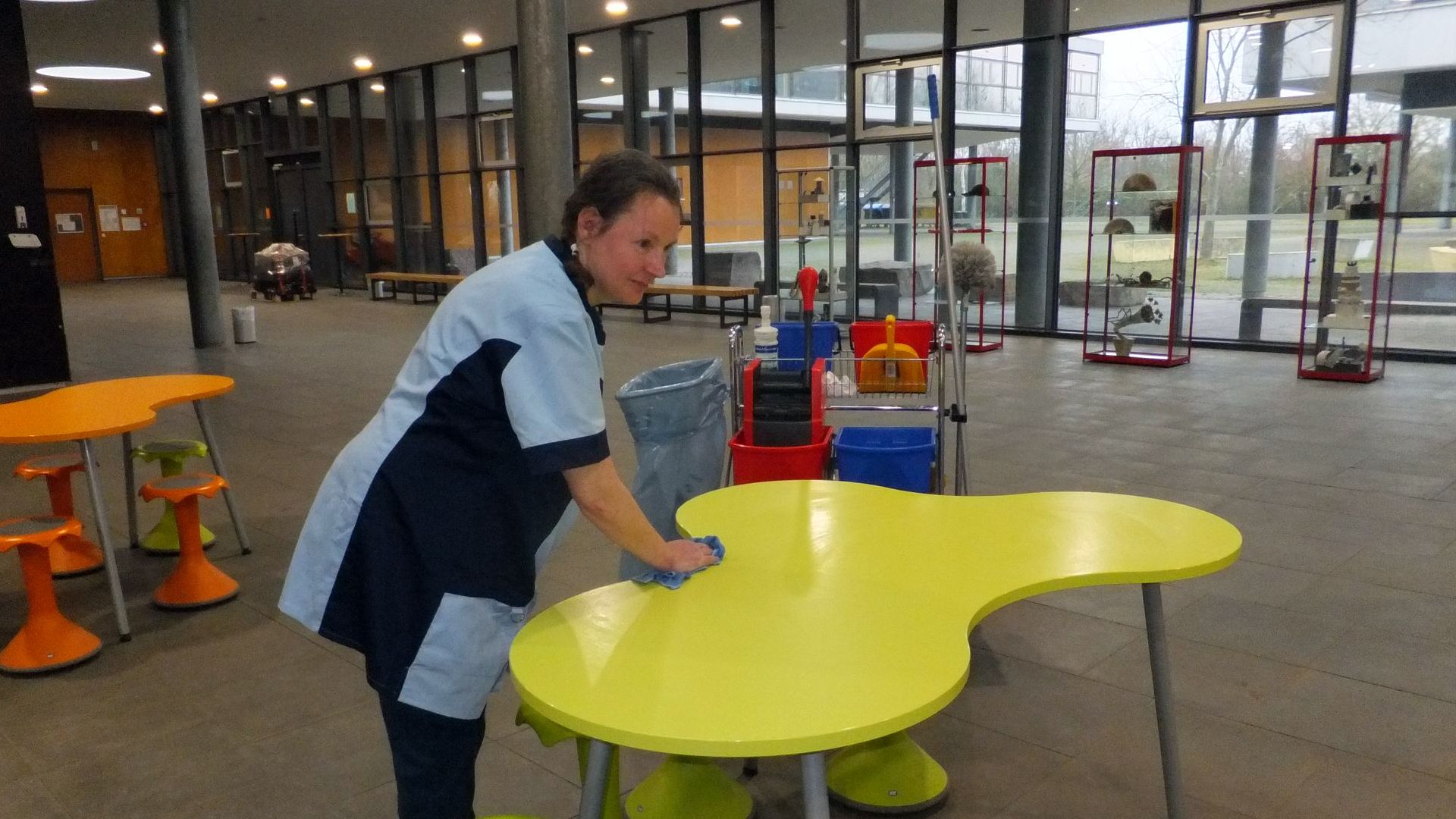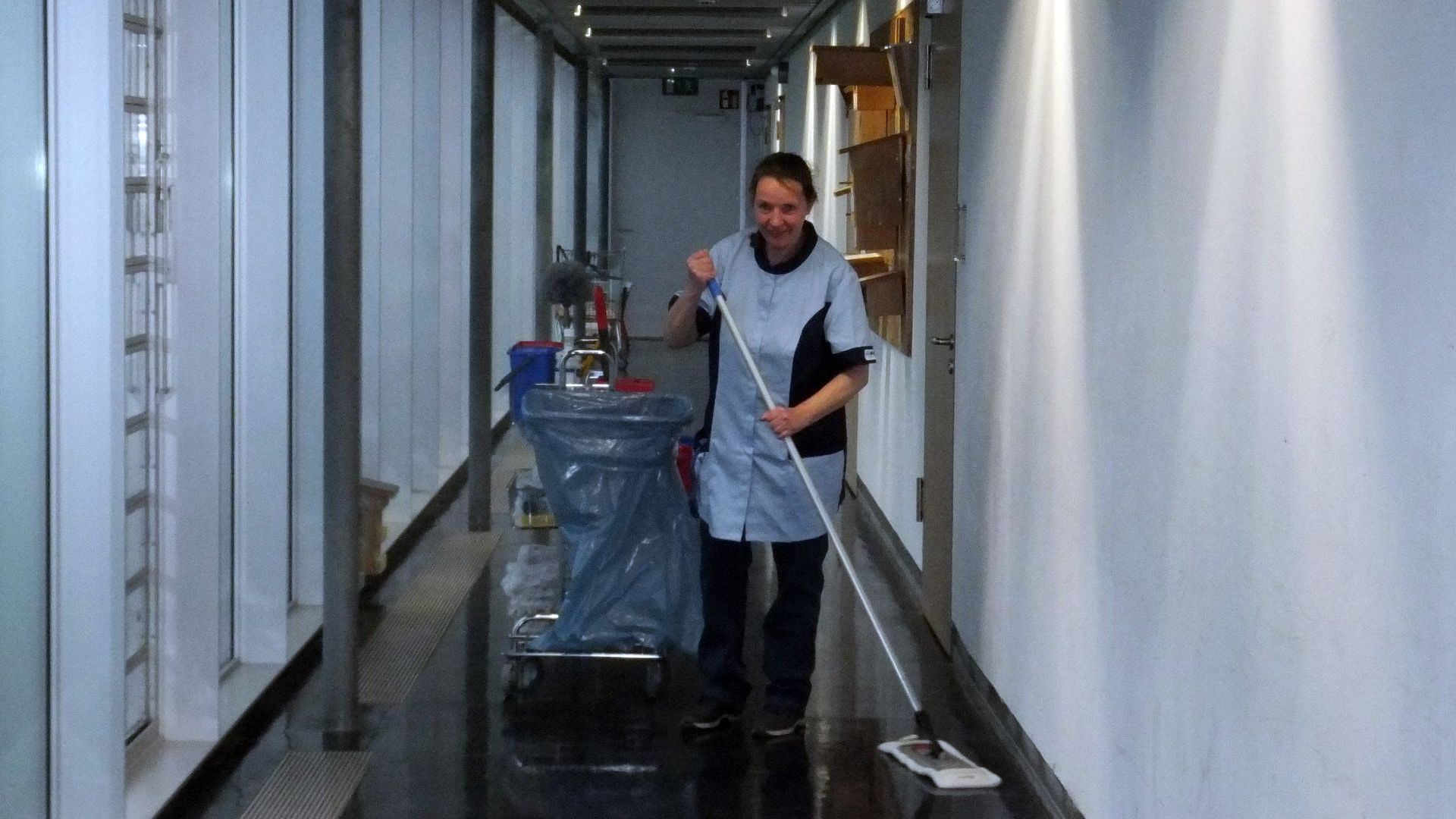 Hier ist die 56-Jährige unter anderem für die Unterhaltsreinigung einer Dreifelderhalle inklusive Umkleideräume und Sanitärtrakt zuständig. Das bedeutet frühes Aufstehen und Dienstbeginn um 5 Uhr. Denn die Sporthalle muss morgens um 7 Uhr nicht nur blitzblank, sondern auch trocken sein, damit der Sportunterricht pünktlich beginnen kann. Während die Schülerinnen und Schüler Unterricht haben, hat Elke Behrens frei. Nachmittags kehrt sie zurück ins Gymnasium und kümmert sich um die Reinigung des Westflügels.